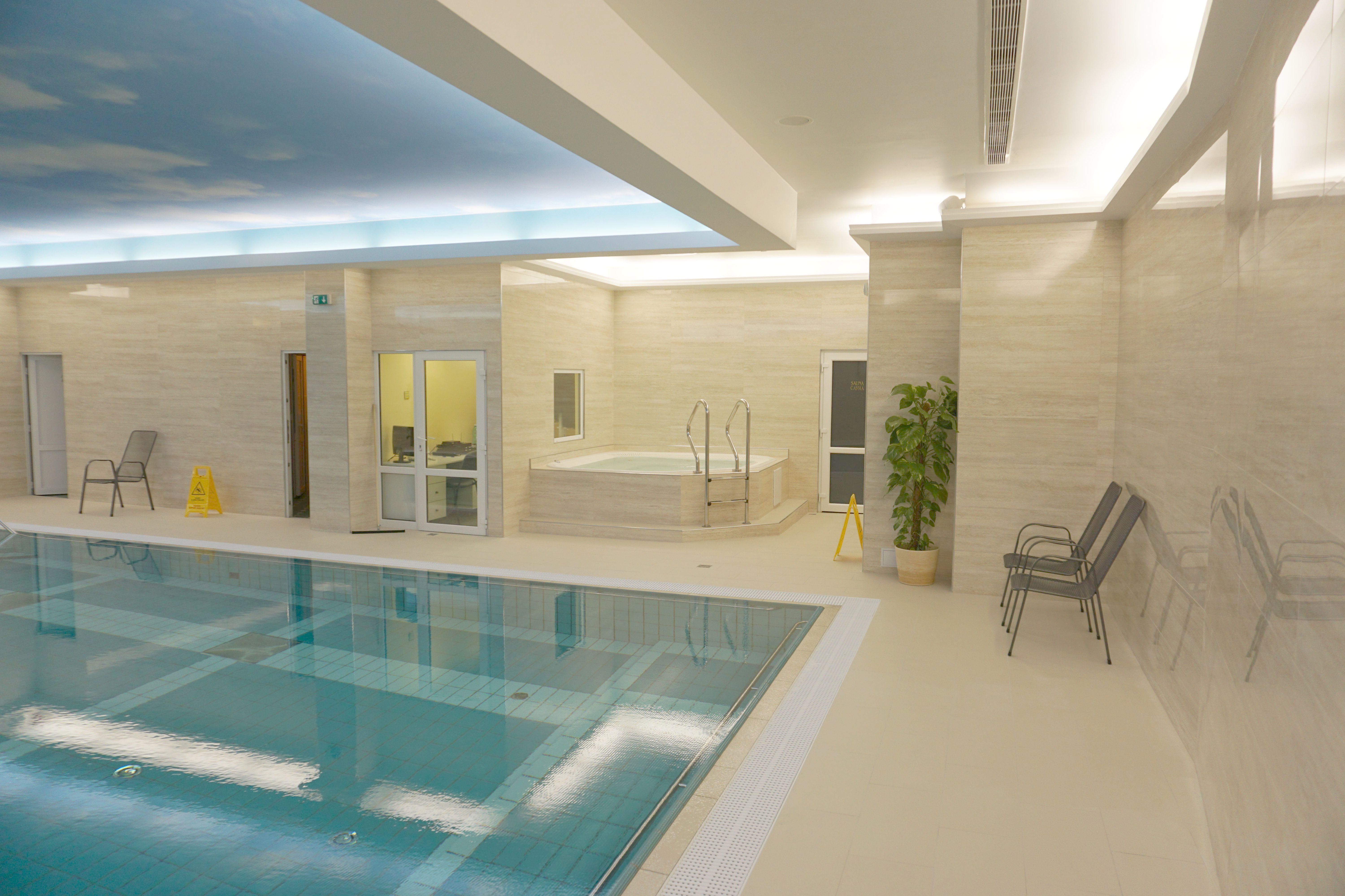 În zona nouă și extinsă a piscinei, există o piscină cu curent și dușuri de masaj, unde vă puteți relaxa la o temperatură plăcută (28-32°C). De asemenea, vă puteți relaxa într-o cadă cu hidromasaj sau în sauna finlandeză. Zona de piscină are acces și la terasa mare la soare, unde vă puteți odihni și admira priveliștea frumoasă asupra centrului Marienbad.